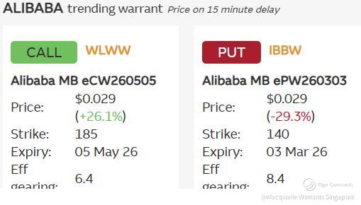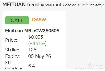 ✳✴ Trending call warrants tracking Meituan ( $Meituan MB eCW260505(OASW.SI)$ ) and Alibaba ( $Alibaba MB eCW260505(WLWW.SI)$ ) are clocking returns between 26% to 44% while Alibaba trending put warrant ( $Alibaba MB ePW260303(IBBW.SI)$ ) is down 29% on the share price outperformance. There are no put warrants available over Meituan