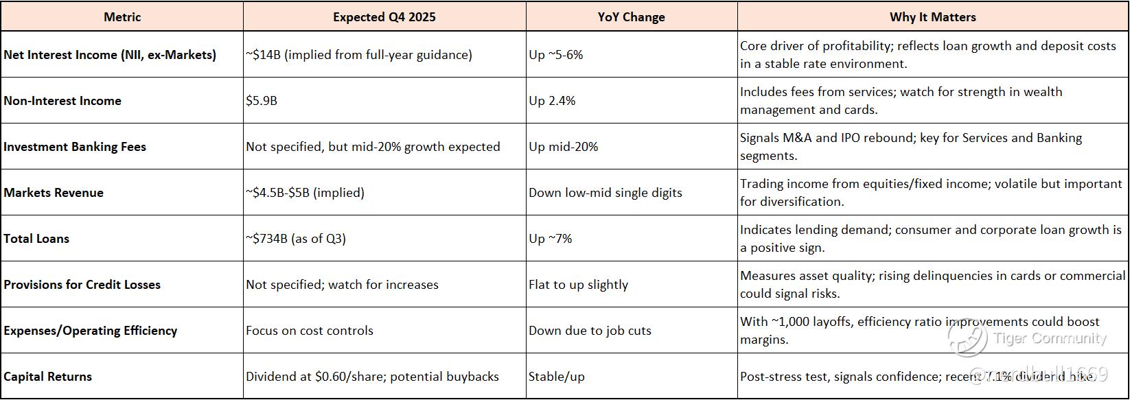 Short-Term Trading Outlook: With shares near $120–$123 (up strongly over the past year), expectations are elevated — some view the stock as "priced for perfection." Options imply a ~4–6% move post-earnings. A solid beat on fees/NII plus upbeat 2026 guidance could drive further upside; a miss on credit or softer outlook risks a 5–7% pullback. Historical reactions lean slightly positive, but high bar means execution is key.