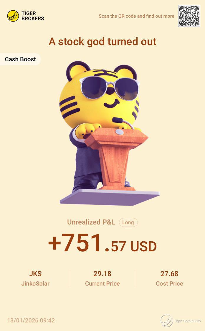 $JinkoSolar(JKS)$ This run on JKS has been really strong! With solar demand continuing to heat up and both earnings and market expectations improving, the stock kept climbing — holding on is definitely the right move.