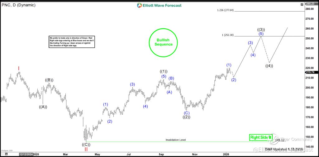 From its 2025 low, PNC created a three-swing advance. This move broke above the 2024 peak of $216. Wave ((1)) ended at $203, followed by Wave ((2)) at $176. Now, Wave ((3)) is in progress. Therefore, the stock has an incomplete bullish sequence targeting equal legs area $252 – $277.