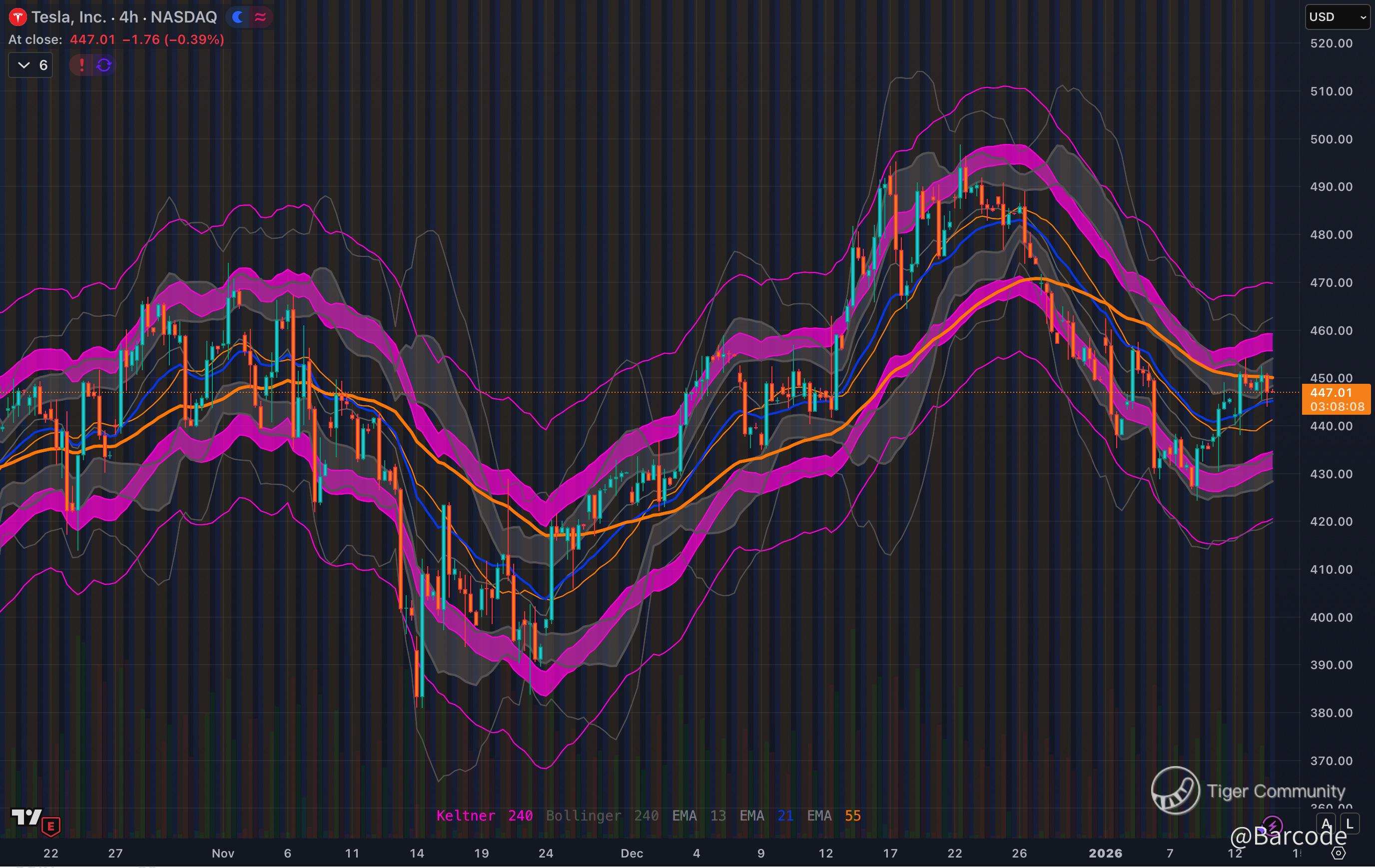 $TSLA is sitting on a make or break level at $444, where dealer gamma, Bollinger support and liquidity either stabilise this pullback or trigger a fast volatility sweep.