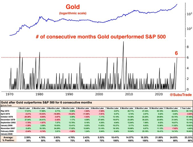 Gold has now outperformed the S&P 500 $S&P 500(.SPX)$ for 6 consecutive months, the longest streak since the Global Financial Crisis π¨π¨