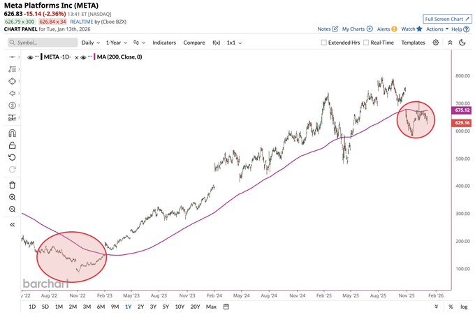 Meta $META has now traded below its 200-day moving average for the longest period of time in 3 years ππ