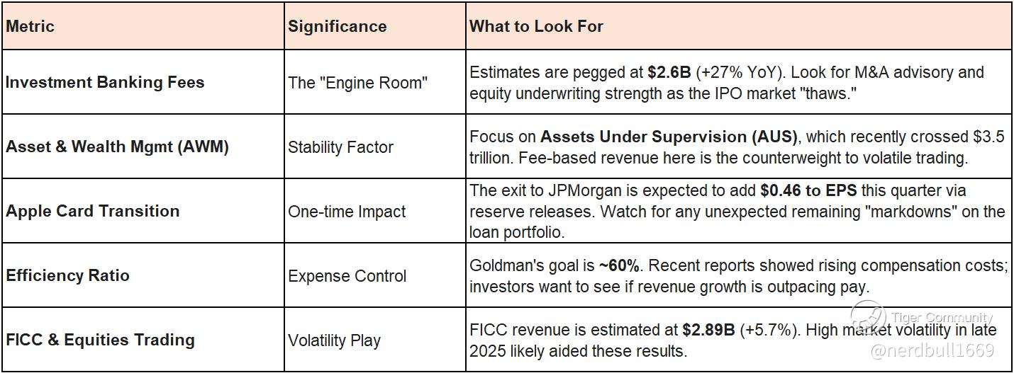 $Goldman Sachs(GS)$ is scheduled to report its fiscal Q4 2025 earnings on Thursday, January 15, 2026, before the market opens.