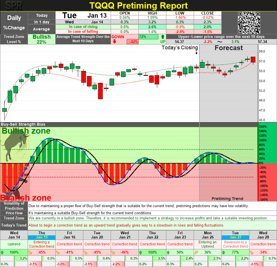 Short-term trend assessments also place TQQQ in a bullish zone, but price action indicates a transition toward a correction sequence, signaling slower momentum and more frequent short-term pullbacks.