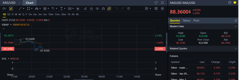 Just now, silver briefly plunged over 6%, retreating from its historic high of $93.61 to $87.45.