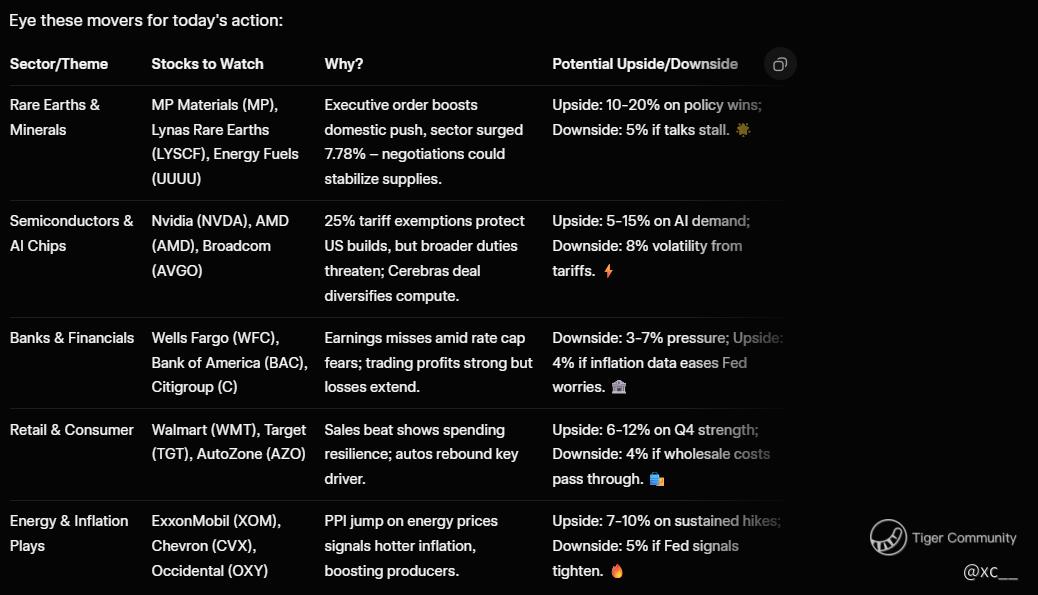 Opportunities abound in this whirlwind: Swing into rare earths for quick gains on policy hype, but hedge with puts amid court tariff risks. Long AI plays like Cerebras-linked firms or NVDA for compute boom, targeting 15% upside as deals accelerate innovation. Short overvalued banks if rate caps materialize, or pivot to consumer stocks riding sales momentum. My plan? 40% allocation to minerals for growth, 30% semiconductors for tech edge, 20% energy hedges, and 10% cash to pounce on dips β diversification crushes FOMO! Stay nimble, volatility's your friend. ππ