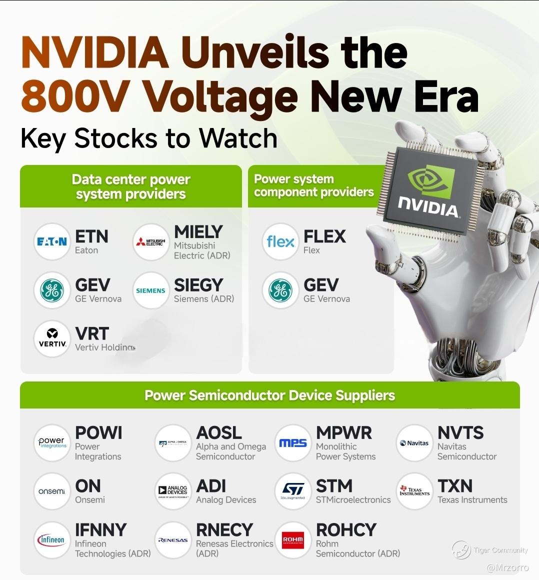 $Vertiv Holdings (VRT.US)$ : Announced strategic cooperation with NVIDIA on May 19, 2025. The company plans to officially launch its 800VDC power supply product series in the second half of 2026, ahead of the release of NVIDIA Kyber and NVIDIA Rubin Ultra platforms.