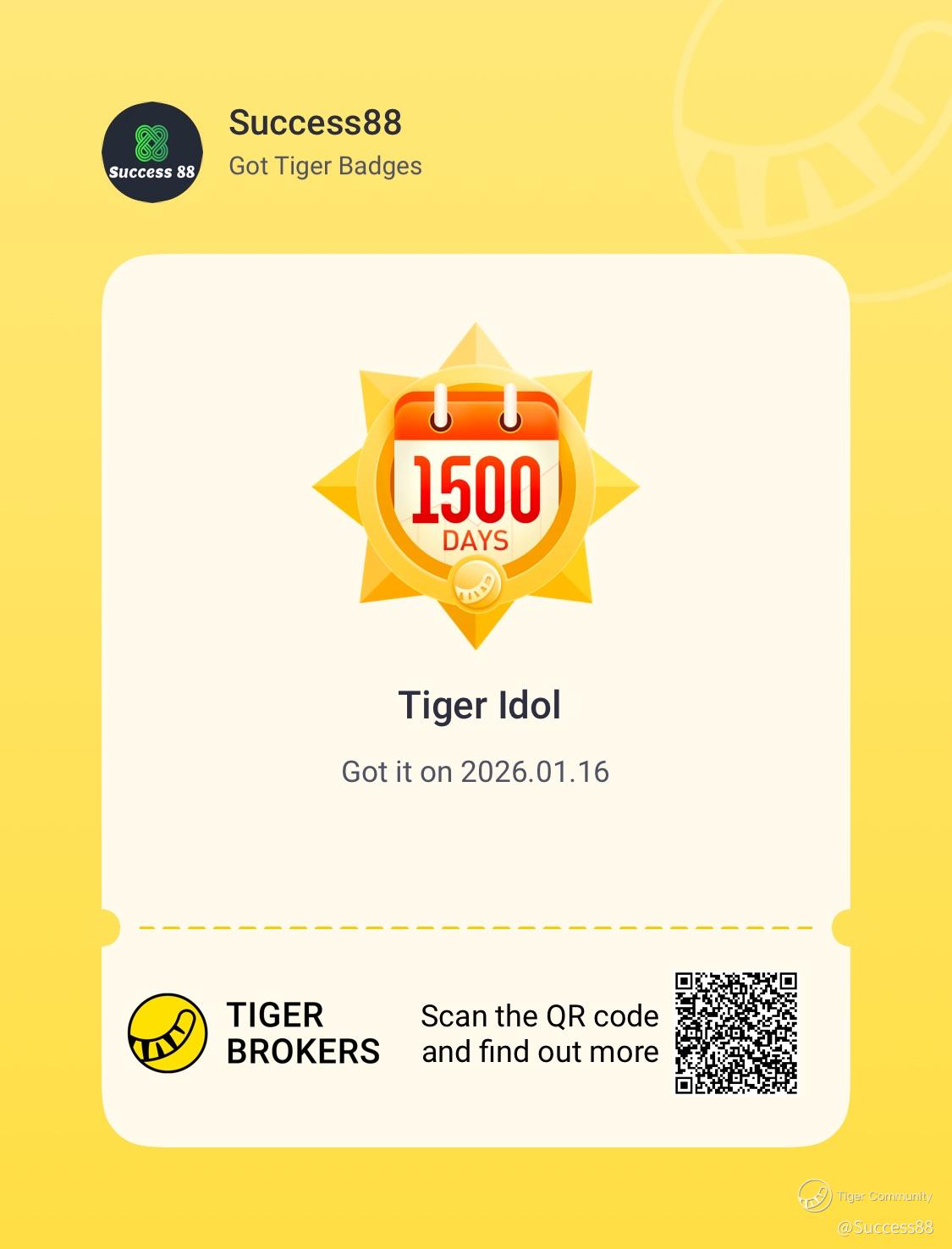 Just got a Tiger Idol check in 1500 days badge. Happy πππShare to my friends come take a look. @koolgal @MHh @SR050321 @HelenJanet @Pilates @TigerEvents @Tiger_SG @TigerClub @TigerStars