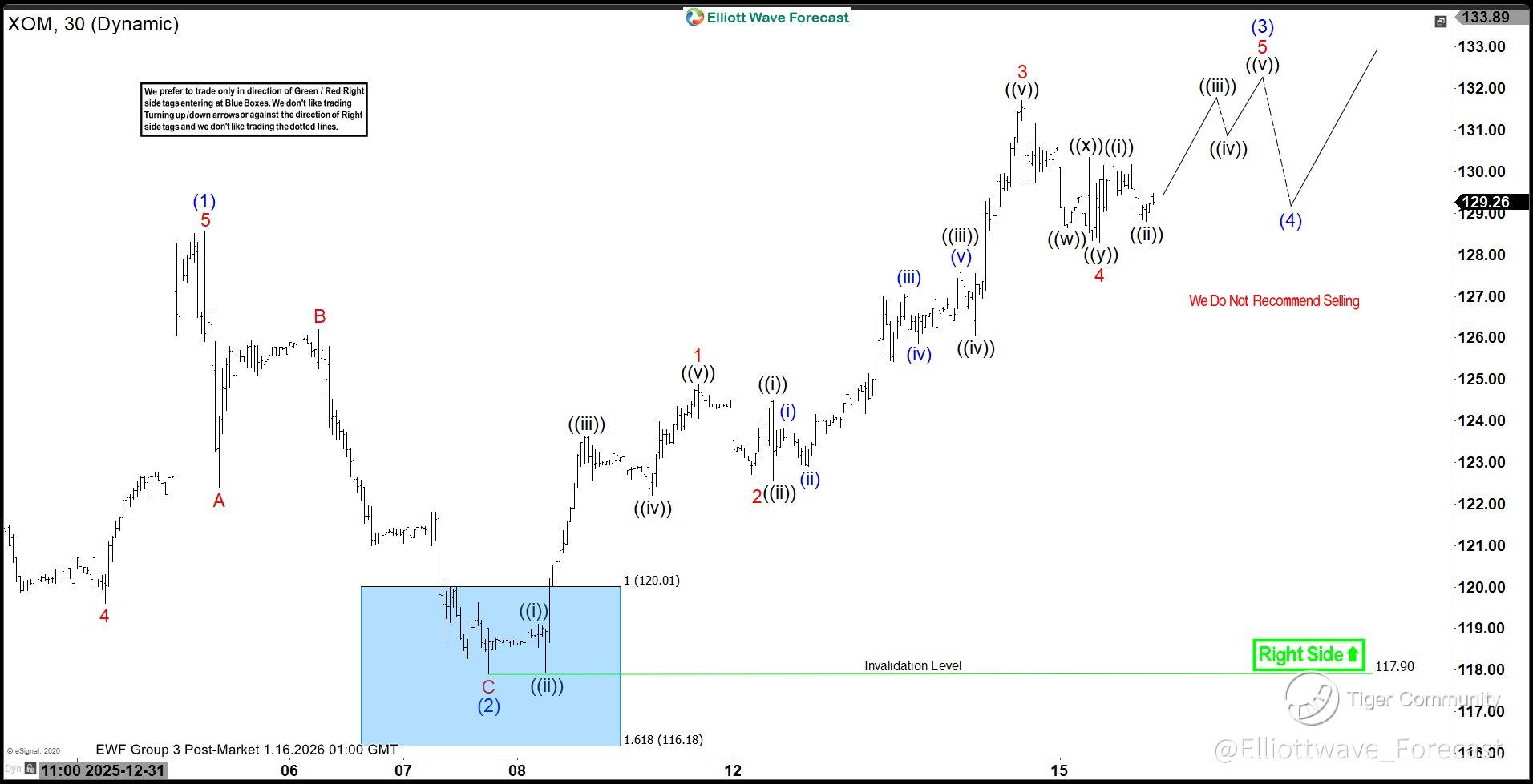Exxon Mobil (XOM) has reached a new all‑time high, confirming that bullish momentum has returned. The near‑term cycle, which began from the November 26, 2025 low, is unfolding as a five‑wave impulse. From that origin, wave (1) concluded at $125.93, followed by a corrective decline in wave (2) that reached $118.27. The internal subdivision of wave (2) formed a zigzag Elliott Wave structure. Within this correction, wave A finished at $122.39 and wave B peaked at $126.20. Wave C declined to $117.90, completing wave (2) at a higher degree.