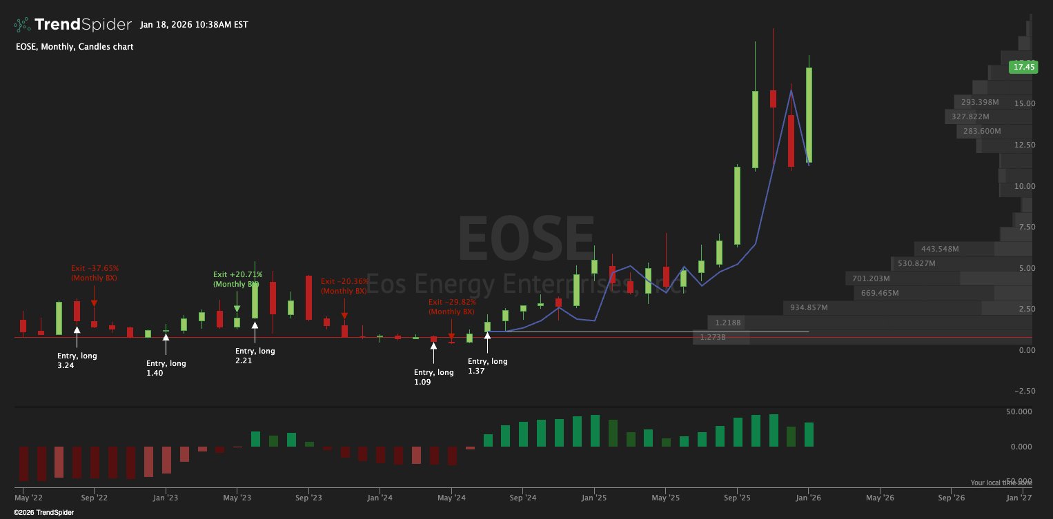 $Eos Energy Enterprises Inc.(EOSE)$ is up over 1,500% since our Monthly BX model first met criteria.