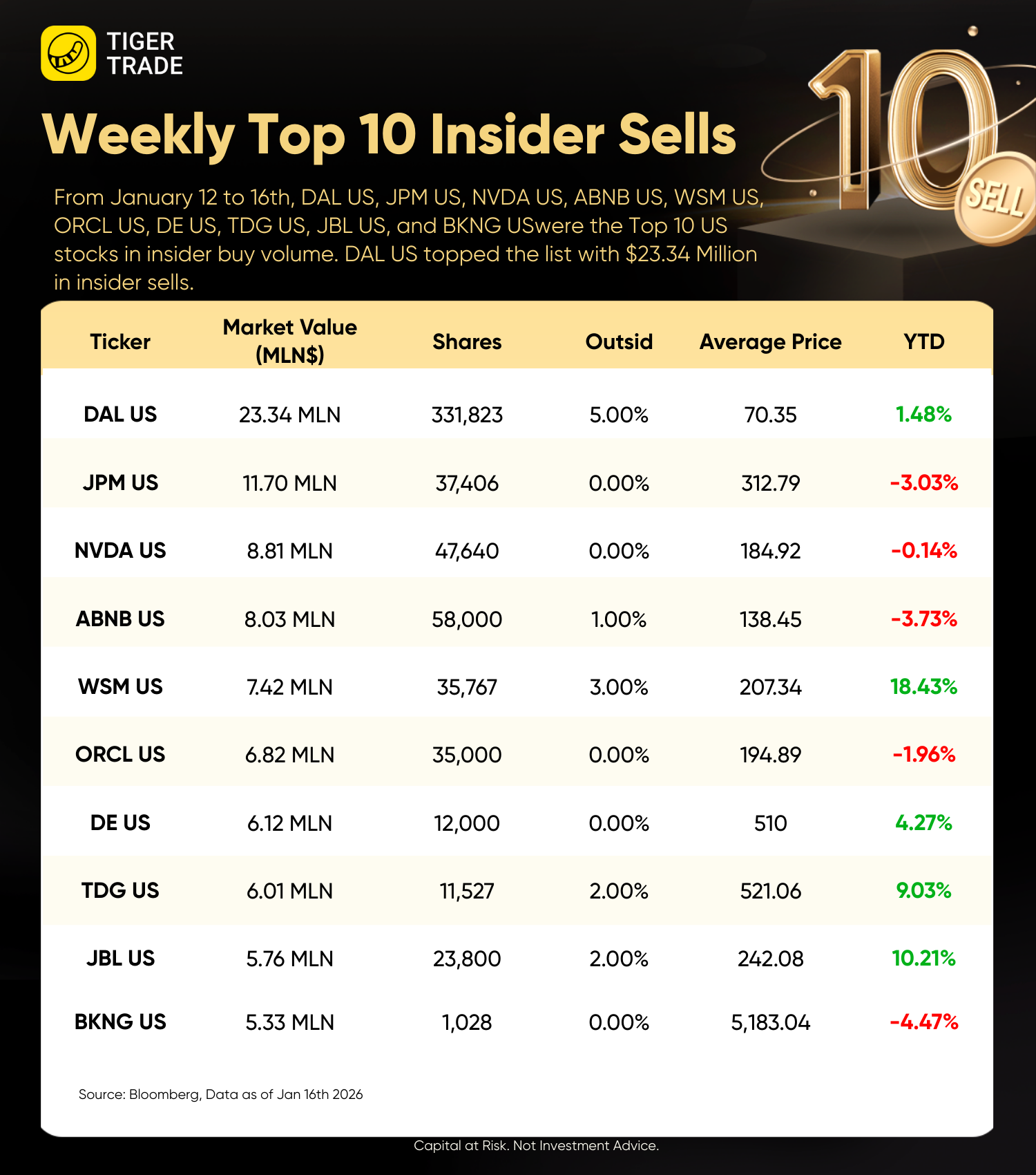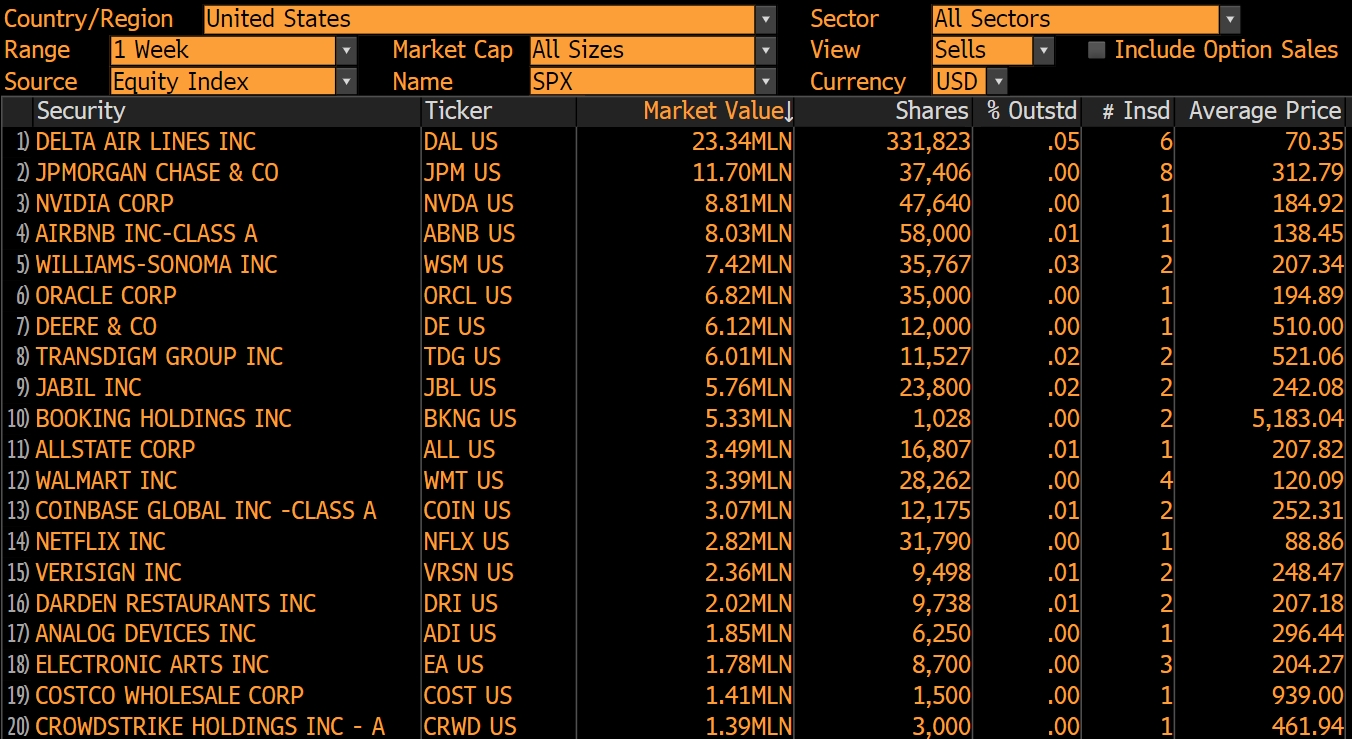 Firstly, the top 10 insider stock sales, ranked by amount, were $DALATA HOTEL GP(DAL.UK)$ $JPMorgan Chase(JPM)$ $NVIDIA(NVDA)$ $Airbnb, Inc.(ABNB)$ $Williams-Sonoma(WSM)$ $Oracle(ORCL)$ $Deere(DE)$ $TransDigm(TDG)$ $Jabil Circuit(JBL)$ $Booking Holdings(BKNG)$