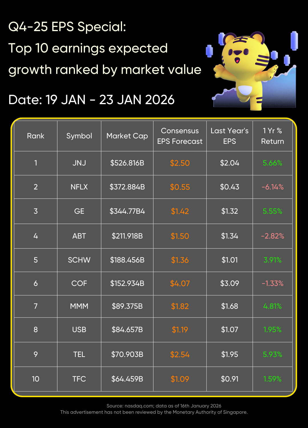 On January 19 to January 23, $Johnson & Johnson(JNJ)$ $Netflix(NFLX)$ $GE Aerospace(GE)$ , $Abbott Laboratories(ABT)$ , $Charles Schwab(SCHW)$ , $Capital One(COF)$ $3M(MMM)$ , $United Community Banks(UCB)$ $TE Connectivity(TEL)$ , $Truist Financial Corp(TFC)$ , $Babson Capital Corporate Investors(MCI)$ , $Fastenal(FAST)$ , $Fifth Third(FITB)$ , $LM Ericsson Telephone(ERIC)$ , $Huntington Bancshares(HBAN)$ $Northern(NTRS)$ , $Teledyne(TDY)$ , $McCormick(MKC)$ , $East West(EWBC)$ and $Pinnacle Financial Partners(PNFP)$ are expected to release their earnings, and consensus earnings per share forecasts are higher than data from the same period last year.