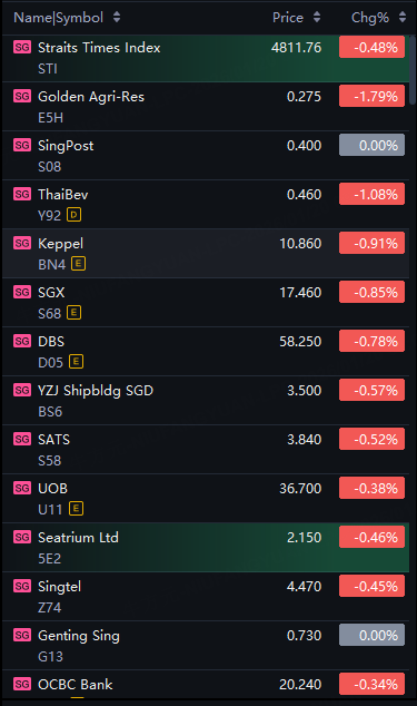 Singapore stocks opened lower on Tuesday. STI down 0.5%; Keppel, DBS, SGX down 1%.