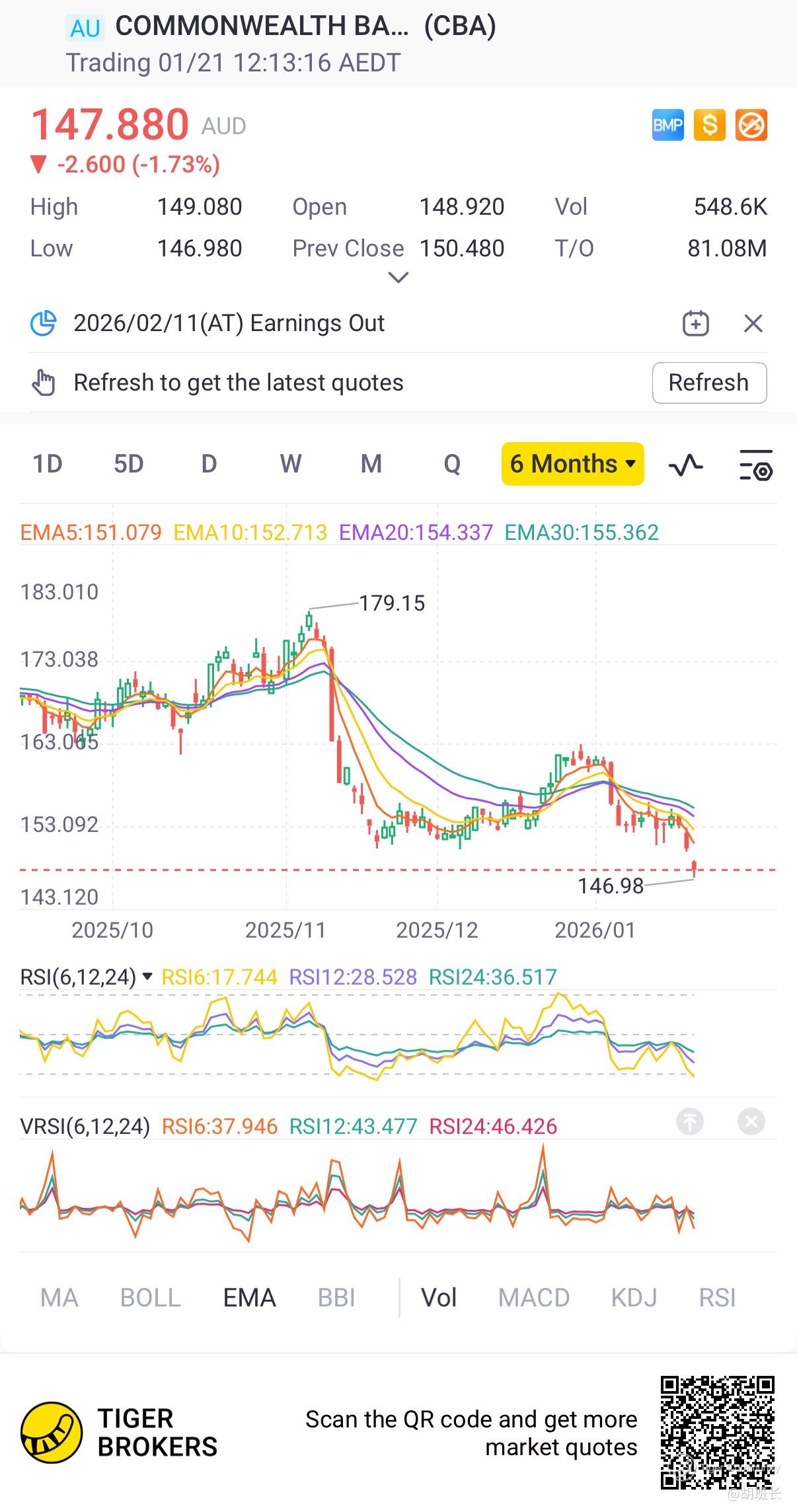 $COMMONWEALTH BANK OF AUSTRALIA(CBA.AU)$  6-month low