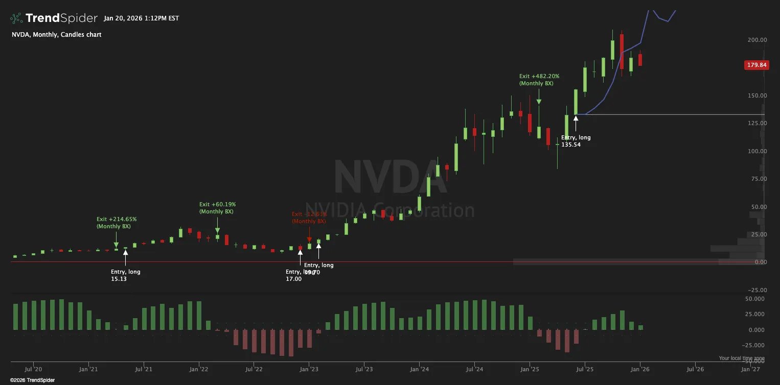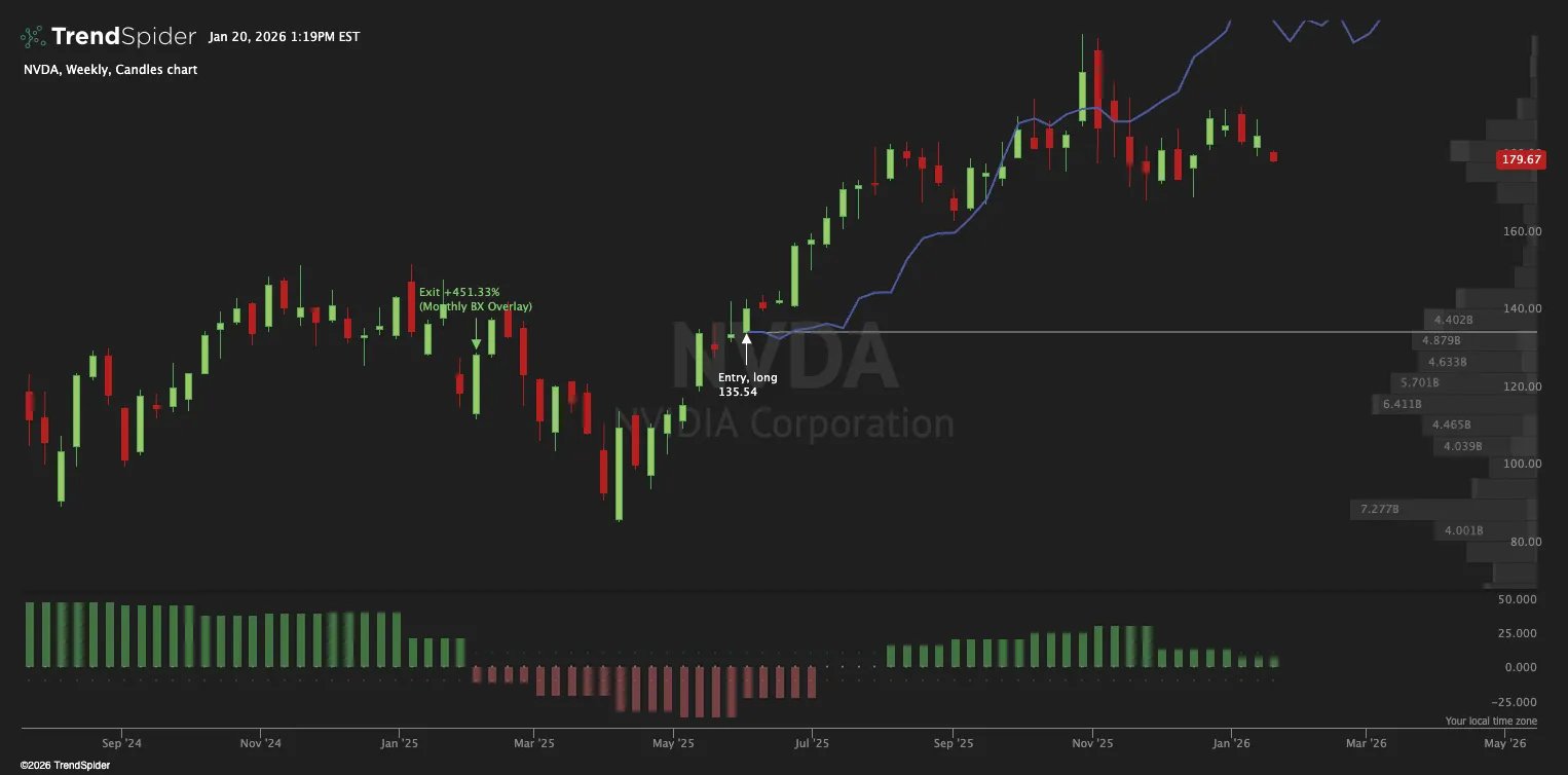 Back in June 2025, the Monthly BX for NVDA flipped and increased. That’s the moment my system considers a new bull cycle “on.” I don’t try to catch the exact bottom. I wait for that confirmation. Since that signal, NVDA has climbed a little over 32 percent, even though the last four months have felt dead.