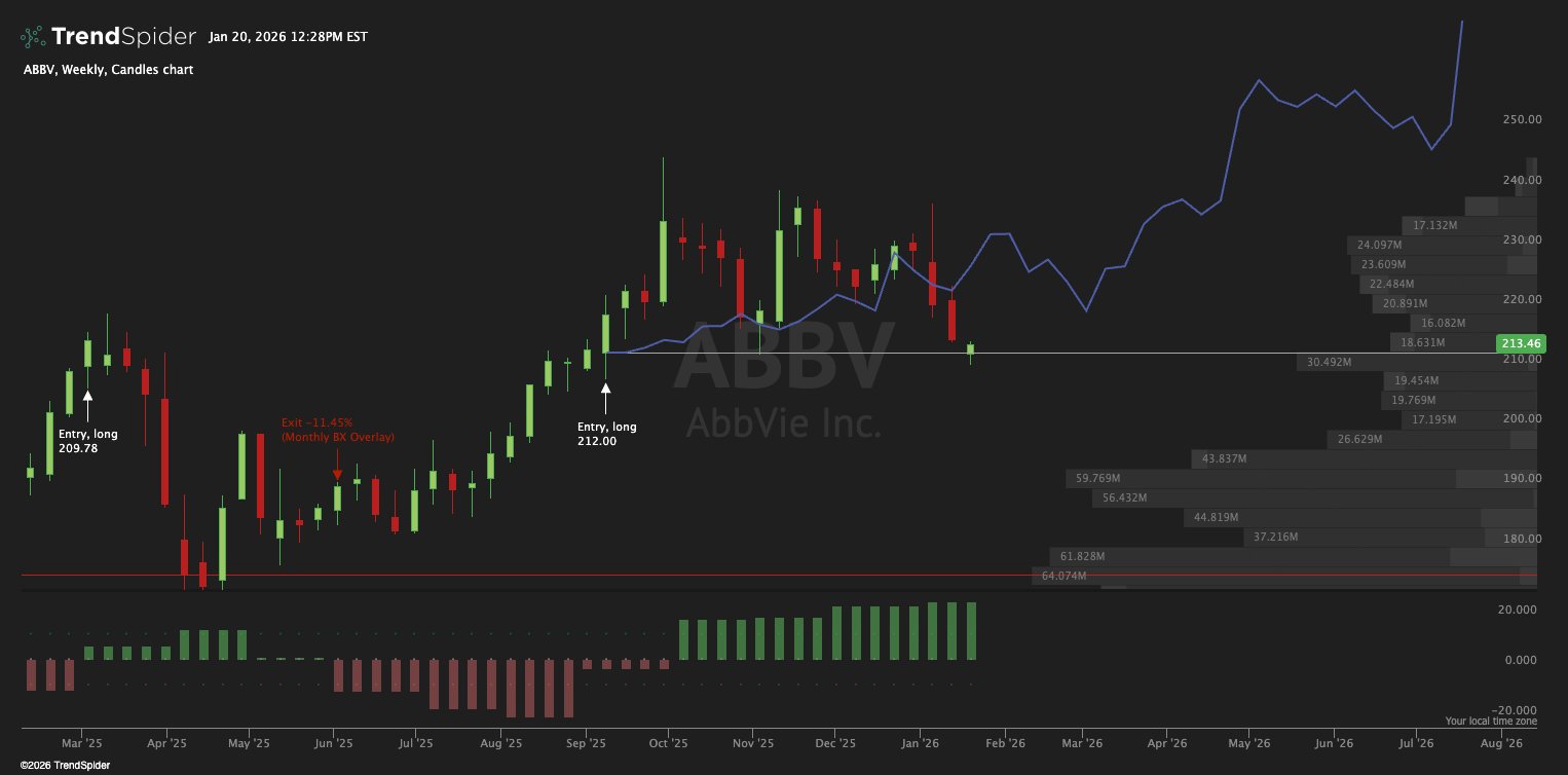 Monthly BX overlay still shows a bull cycle, even though price has pulled back since our entry signal in September.