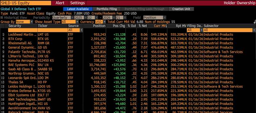 The largest and highest-yielding defense ETF is $Global X Defense Tech ETF(SHLD)$ , currently exceeding $6.9 billion in assets with a management fee of 0.49%, slightly higher than ITA. However, its holdings are more diversified, with $Lockheed Martin(LMT)$ as the largest position at 8% of net assets—far more balanced than ITA. Moreover, SHLD boasts a significant advantage: its portfolio includes European defense companies like Rheinmetall, its third-largest holding at 7.3% of net assets.