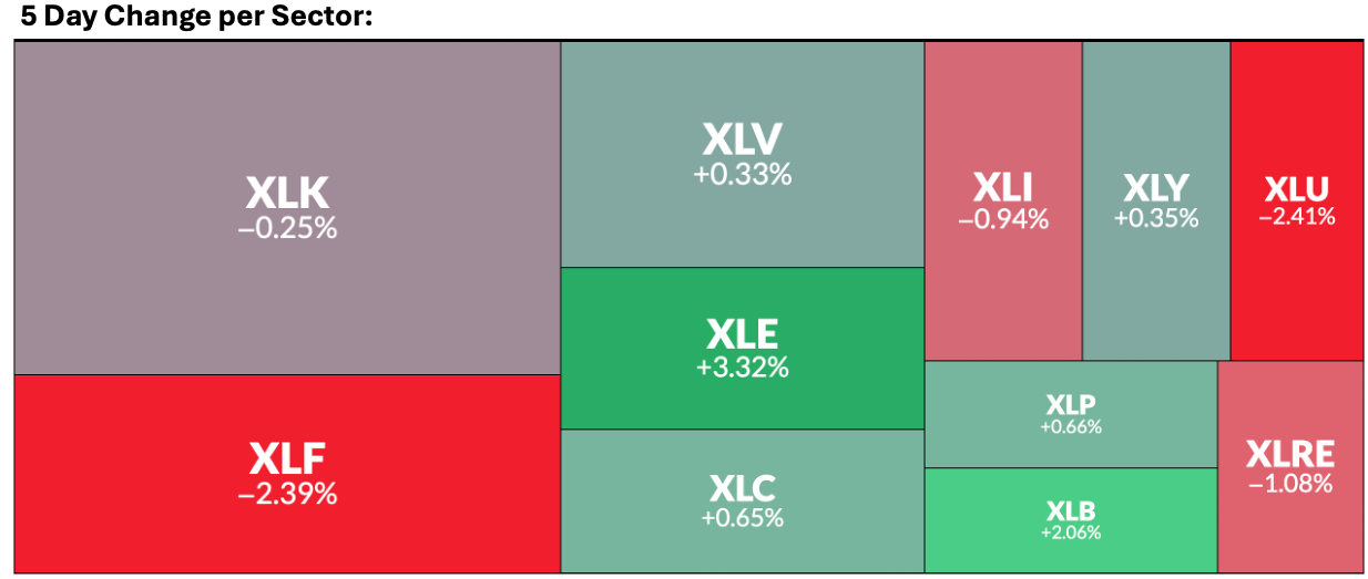 U.S. stocks concluded a very volatile week with divergent performance, as strength in mega-cap technology shares counterbalanced broad-based weakness elsewhere. The S&P 500 $S&P 500(.SPX)$ finished -0.35% for the week, the Nasdaq Composite $NASDAQ(.IXIC)$ gained 0.3% for the week, and the Dow Jones Industrial Average $Dow Jones(.DJI)$ retreated 0.6%. Investor sentiment remains anchored in neutral territory, with the Fear & Greed Index reading 52.