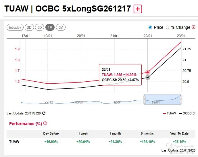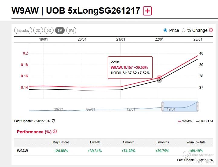 UOB’s share price continues to trade above its short‑term moving averages, indicating sustained price strength relative to recent trend levels. In line with movements in the underlying stock, the $UOB 5xLongSG261217(W9AW.SI)$ rose around +40% over the week ended 23 Jan, while the corresponding $UOB 5xShortSG261217(9XCW.SI)$ declined around -34%.