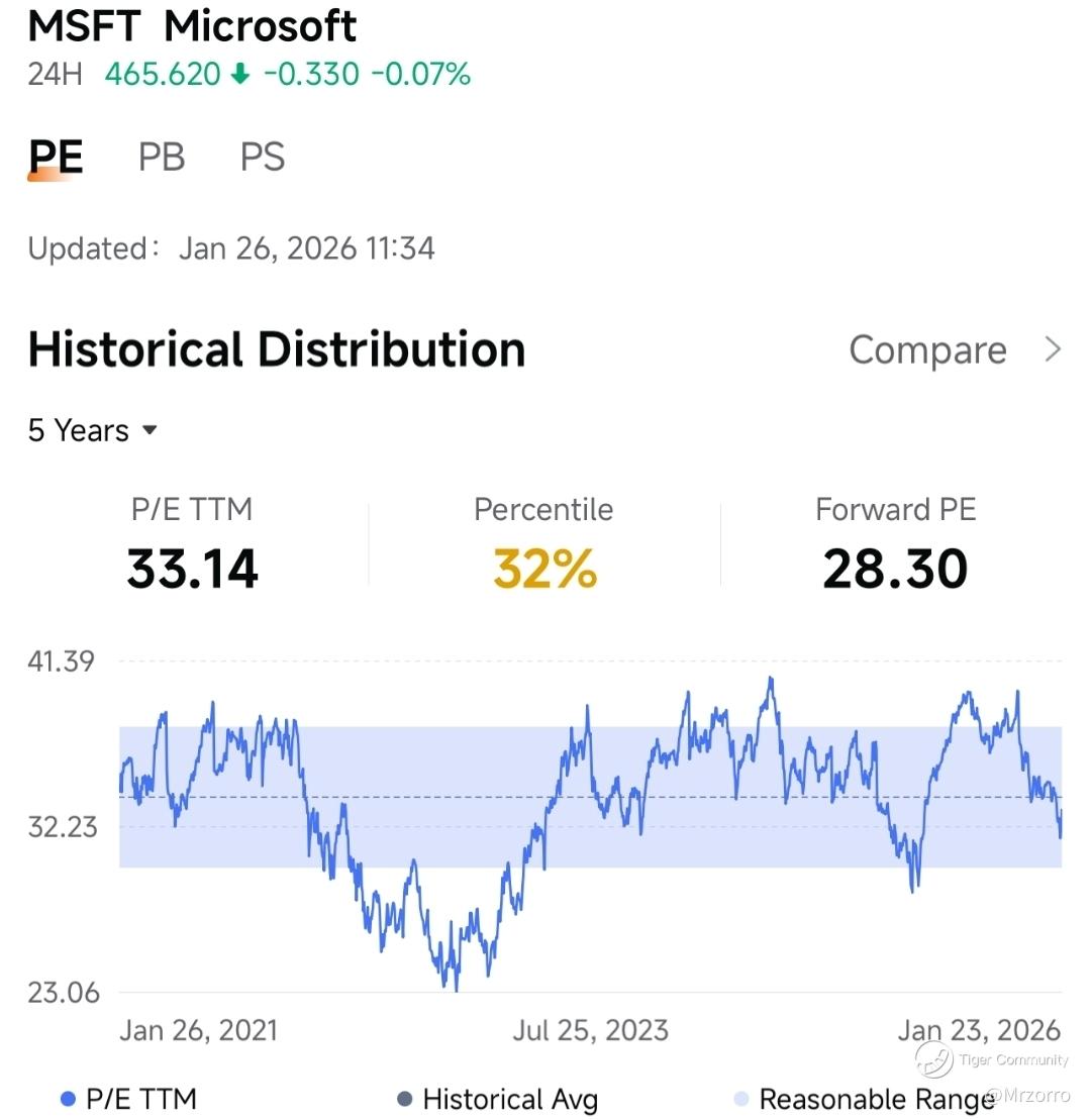 Microsoft's P/E ratio stands at 33.14x, placing it in the 32th percentile of its five-year range—significantly below its 92th-percentile level three months ago.