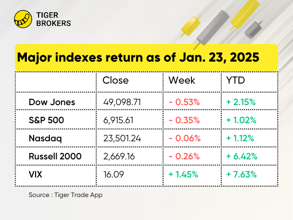 Slight pullback: the $S&P 500(.SPX)$ (-0.35%, 6,915.61), the $Dow Chemical(DOW)$ (-0.53%, 49,098.71), and the $NASDAQ(.IXIC)$ (-0.06%, 23,501.24)posted fractional declines for the second week in a row.