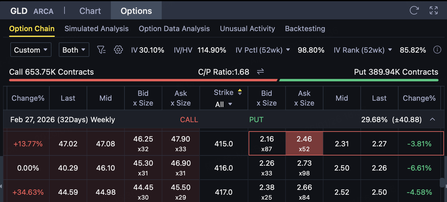 This Put offers protection when GLD falls sharply, guaranteeing investorsYou can sell stocks at as little as $415, thereby locking in the maximum loss.