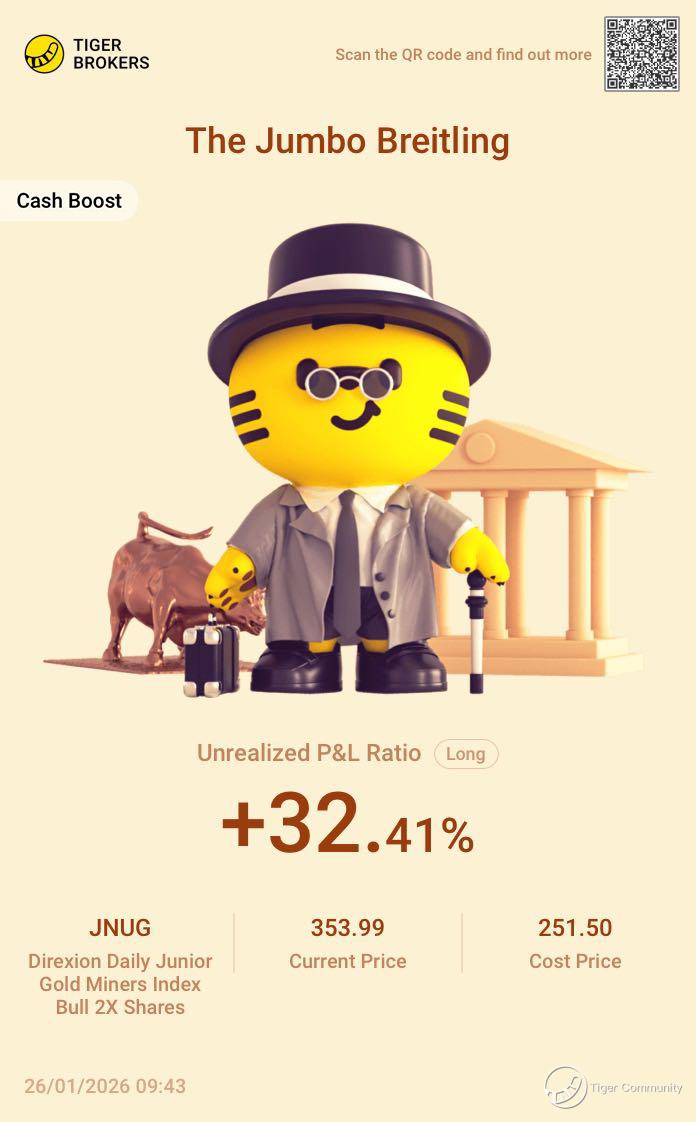 $Direxion Daily Junior Gold Miners Index Bull 2X Shares(JNUG)$ This run on JNUG has been awesome — junior gold miners rallying with gold itself and that leveraged boost just amplified the gains. Watching the profits climb really feels great, this one just delivered!