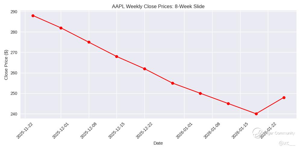 $Apple(AAPL)$ Whoa, folks—Apple's stock just wrapped up its eighth straight losing week, the longest skid since May 2022! 😱 Shares have plummeted from a peak near $288 down to around $248, shedding over 13% in a brutal sell-off. With fund outflows hitting Apple harder than any other Magnificent 7 giant since last July, and AI-driven memory prices spiking 40-50%, margins are under siege. But hold up—is this the ultimate dip to buy, or a sneaky value trap? Let's dive deep into the chaos, crunch the numbers, and see if Goldman's bold call to load up before January 29 earnings is spot on. 💥