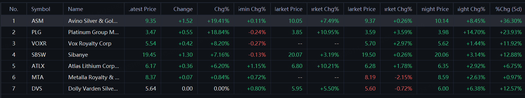 🔹 Precious Metals in Focus, $Avino Silver & Gold Mines(ASM)$ Selected as a Standout: The precious metals sector led market performance, with $Avino Silver & Gold Mines(ASM)$ chosen as a representative name due to its strong price action and sector leverage.