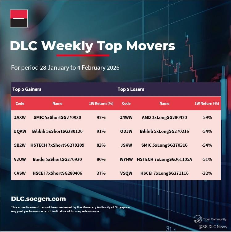 The top performer for the week is $SMIC 5xShortSG270930(ZAXW.SI)$ , supported by a -17.18% decline in $SMIC(00981)$ over the same period. The drop occurred against the backdrop of a broader sell‑off in the tech sector, as investors grew increasingly cautious amid concerns about stretched valuations, elevated capital expenditure, and the potential impact of artificial intelligence on established business models.