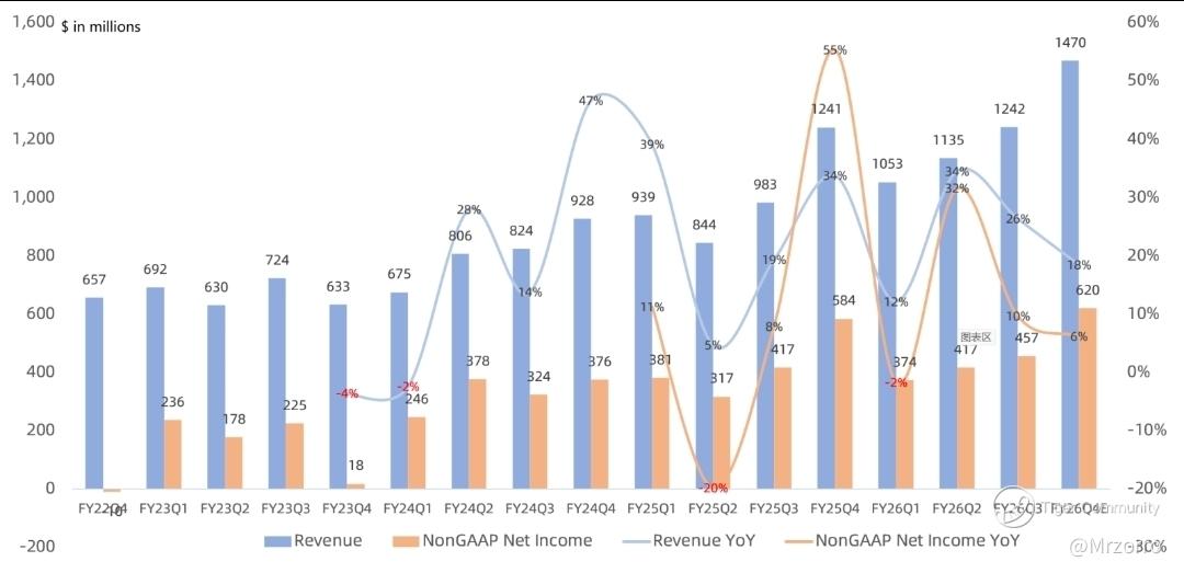 Arm expects FY26 Q4 revenue of $1.47 billion, an increase of 18% year-over-year. Non-GAAP operating profit is projected at $700 million, up 7% year-over-year, with Non-GAAP net income at $620 million, up 6% year-over-year. It is evident that as revenue growth slows, profit growth is decelerating further into single-digit territory.