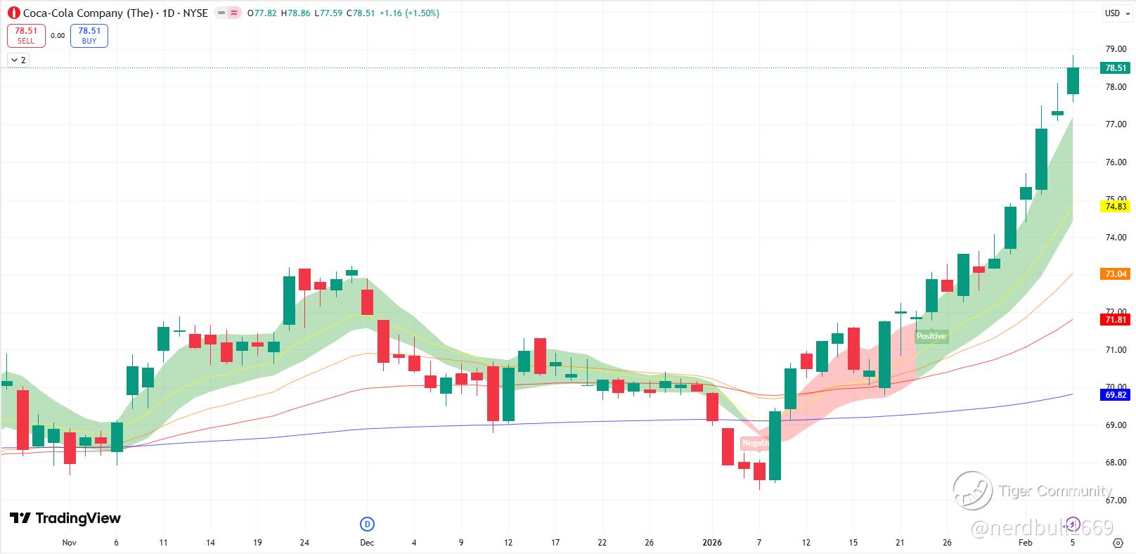 We are seeing KO moving a very strong upside movement ahead of next week earnings release, and as we might know of the unofficial rule of stock price going too significantly higher that its 12-EMA period, we might see a volatility of downside coming, this might mean that KO would show some sideway or correction trading if investors are looking for its 2026 guidance.