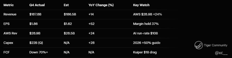 Q4 $187.8B rev +14%, AWS $28.9B +24%.