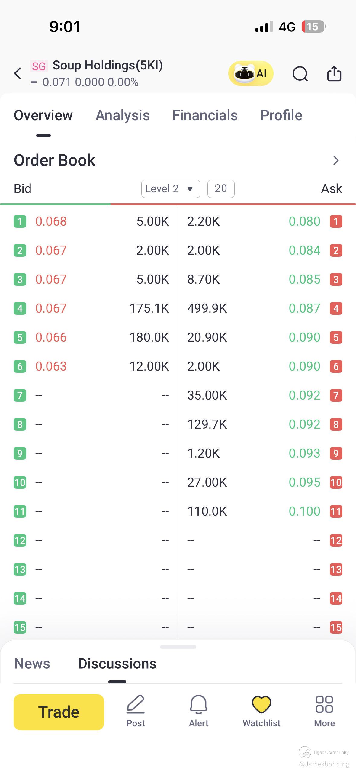 $Soup Holdings(5KI.SI)$ the biggest obstacle is the 500,000 shares selling at 8.7 cents, it costs more than $40,000 to buy up this fellow. I can buy up to 8.7 cents today but I cannot buy that 500,000 lot completely