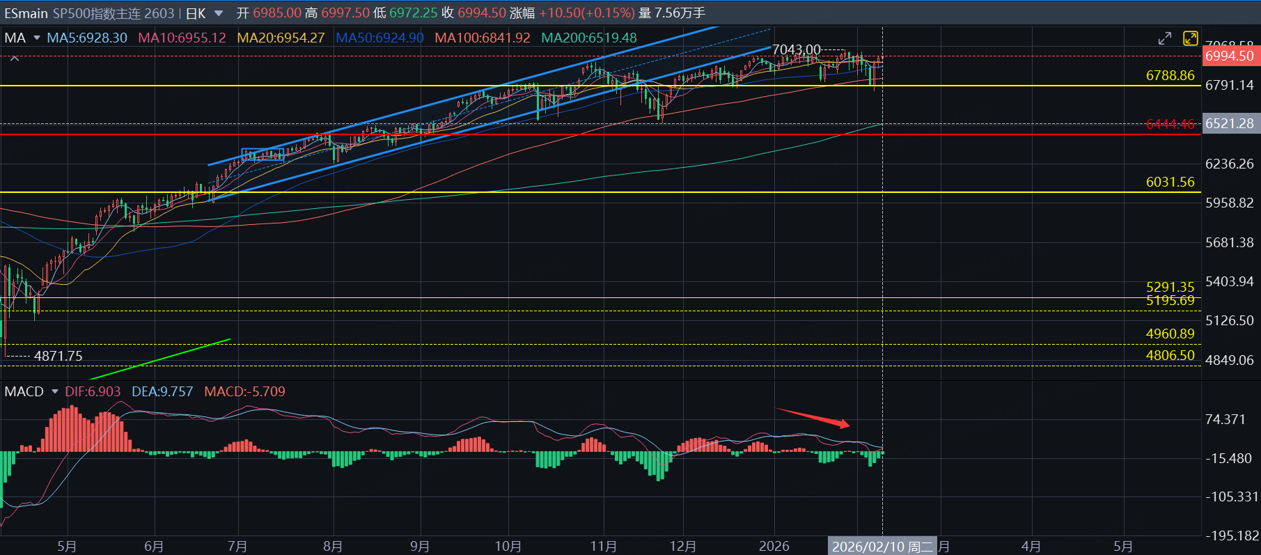 Moreover, if we shift the lens to the main continuous S&P 500 futures contract, price has already pierced the 20-week moving average, and within the daily structure, signs of a “bearish divergence breaking down” are becoming more obvious—given this picture, it is hard for me to bet that a clean, decisive uptrend has restarted.