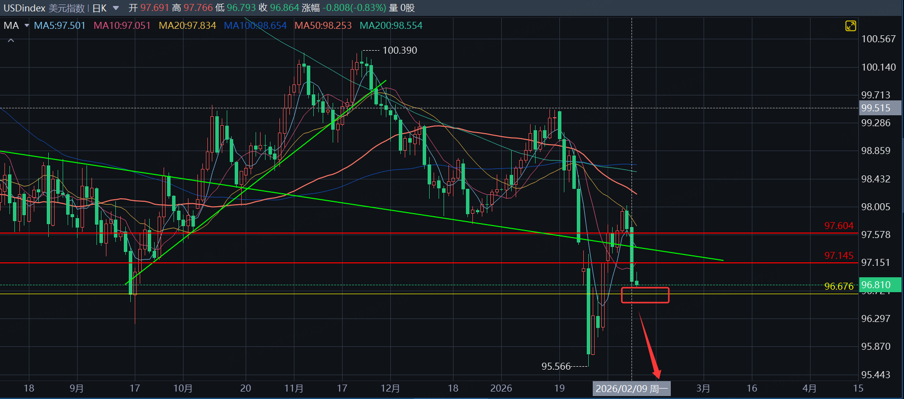 If the DXY were to retest the pre-breakout resistance and hold without breaking down, it could potentially move up toward the 100 level and put high-level pullback pressure on gold/silver and on Hong Kong/A-share markets. But what happened instead was that the DXY looked extremely weak overnight: after testing the 20-day moving average, it rolled over again and broke two support levels in a row.