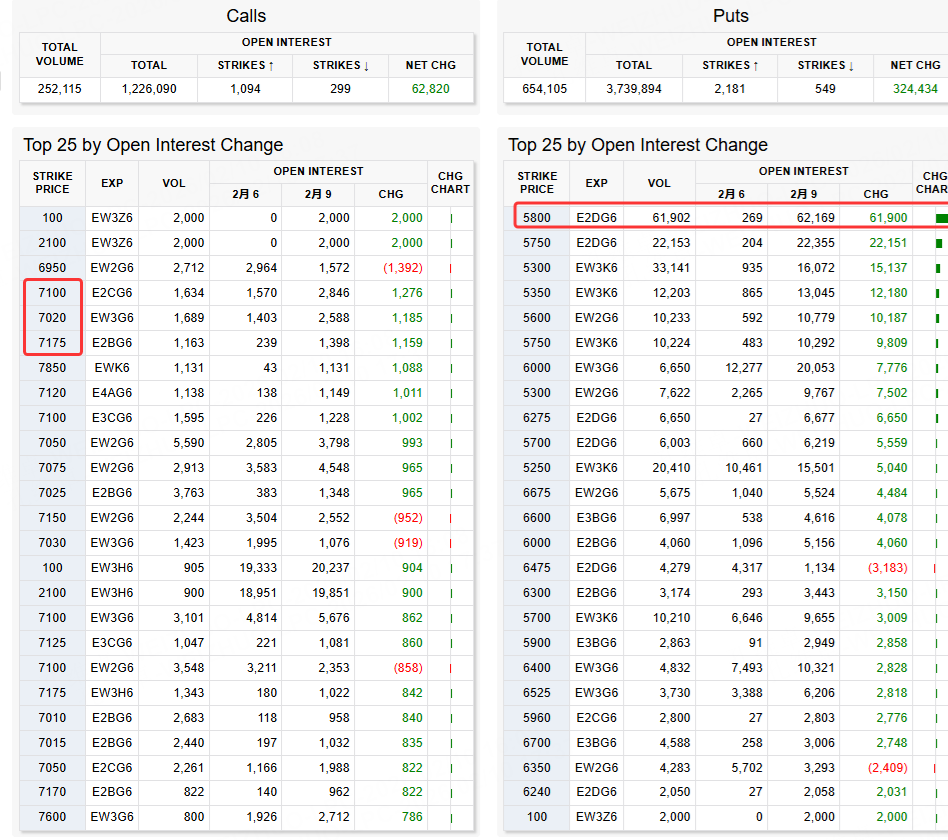 From the latest futures and options trading, we see a large amount of out-of-the-money call activity above 7,000, while large put bets are concentrated at 5,800.