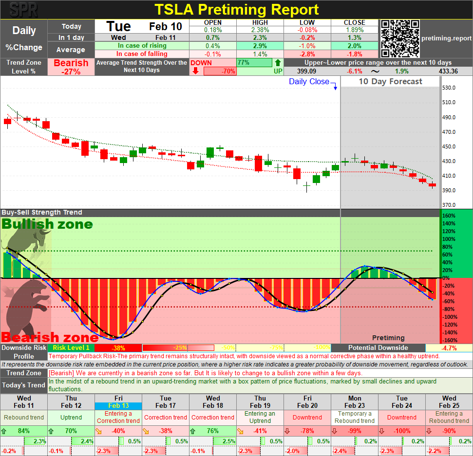 On February 10, 2026, TSLA closed at $425.2, rising +1.89%, reflecting a short-term rebound within an overall bearish trend zone. The price movement suggests temporary buying interest emerging after extended downside pressure rather than a confirmed structural reversal.