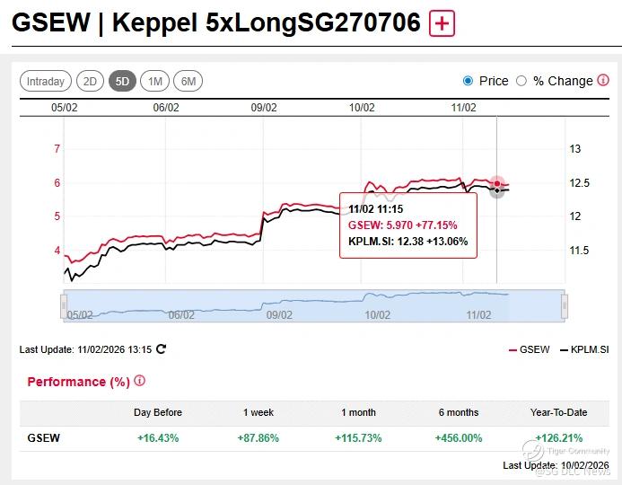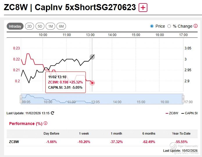 $CapitaLandInvest(9CI.SI)$ also started Wednesday morning (11 Feb) in negative territory, sliding as much as 8.8% after reporting a net loss of S$142 million for the second half ended 31 Dec 2025. Mirroring the move in the underlying, the CapitaLand 5x Short DLC was up around as much as 42%, whereas the CapitaLand 5x Long DLC fell a similar magnitude in early trading.