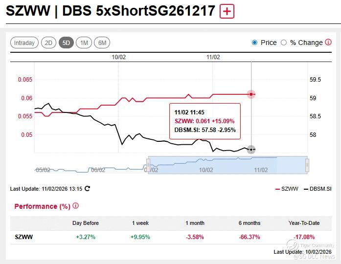 $DBS(D05.SI)$ has declined 2.9% this week (9–11 Feb) following its pre‑market earnings release on Monday (9 Feb), weighed down by weaker‑than‑expected trading income. Tracking the move, the DBS 5x Short DLC has gained about 14% this week, while the DBS 5x Long DLC has fallen roughly 14.5%.