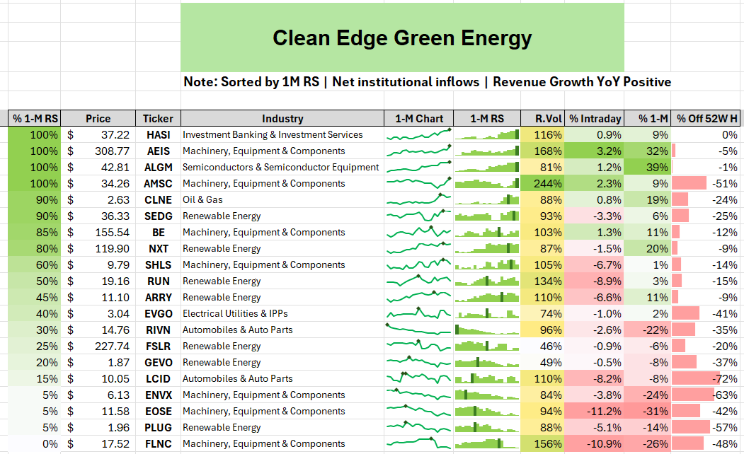 Green Energy Alpha: 20 Strongest Names in the Clean Edge Group sorted by 1-Month Relative Strength %