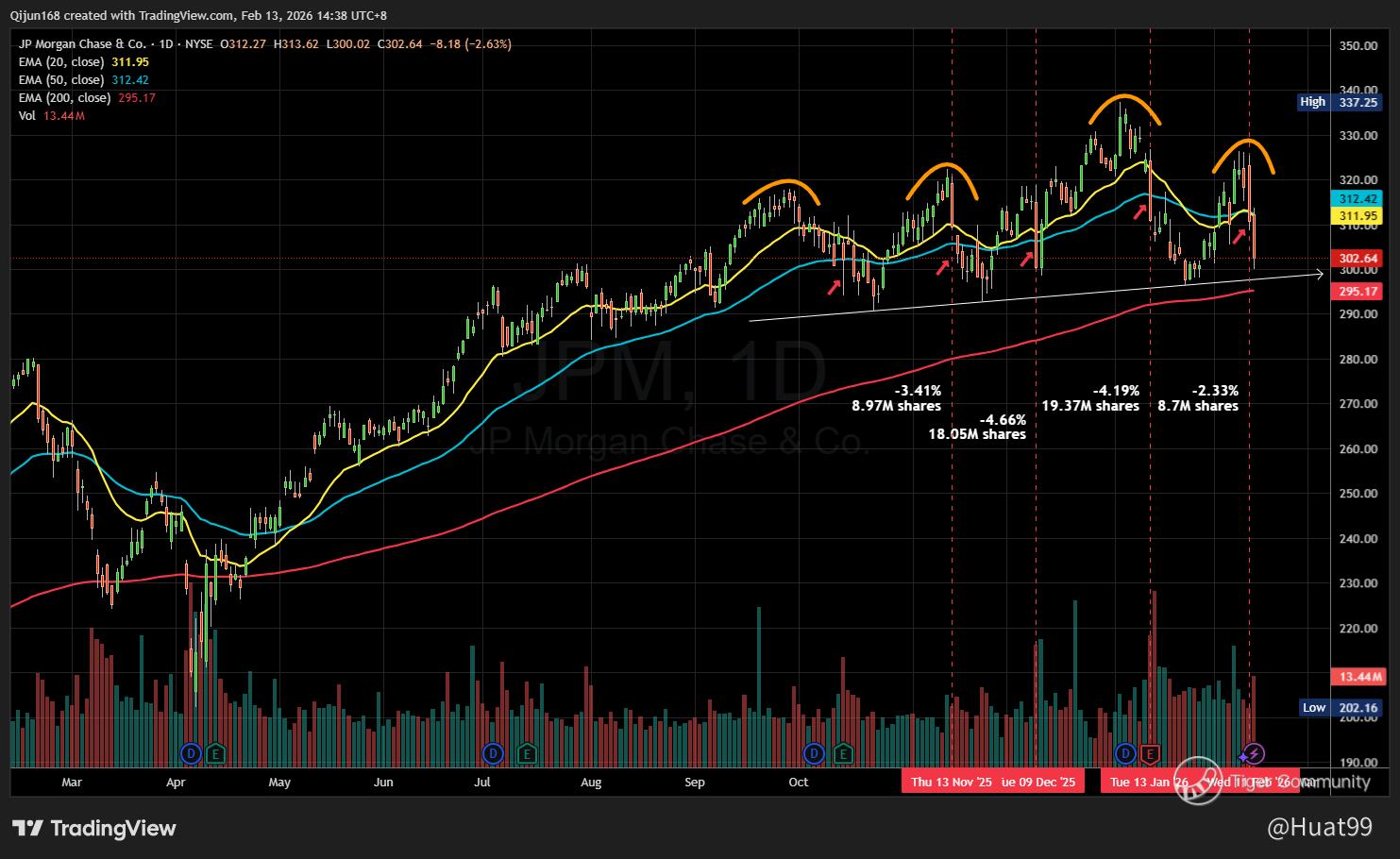 JPM signals a bearish Head and Shoulders top, underscored by heavy institutional distribution (e.g., 19M+ share sell-offs). Now trading below the 20/50 EMAs (~$312), momentum has decidedly shifted negative. The price is aggressively testing the final "line in the sand": the ascending trendline and the critical 200-day EMA at $295. A confirmed break below this $295 floor would validate a major trend reversal, opening the door for a deeper correction toward $270. Bulls must defend this level to keep the long-term uptrend alive.
