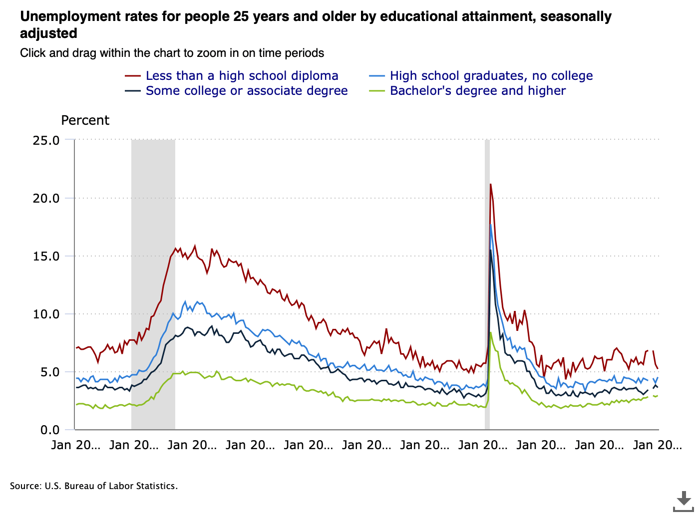 Even when the economy hit its worst in 2009, the unemployment rate for those with a college degree was never over 5.0%. There’s never been a real fear of replacement or disruption for the educated class.