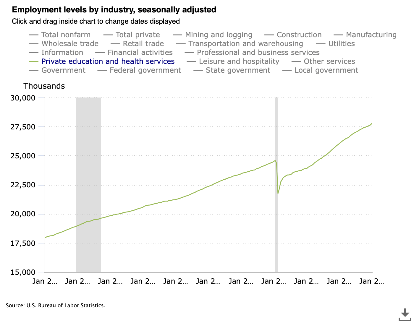 Private education and health services are the most steady growth in jobs, as an aging population is cared for through plentiful government programs.
