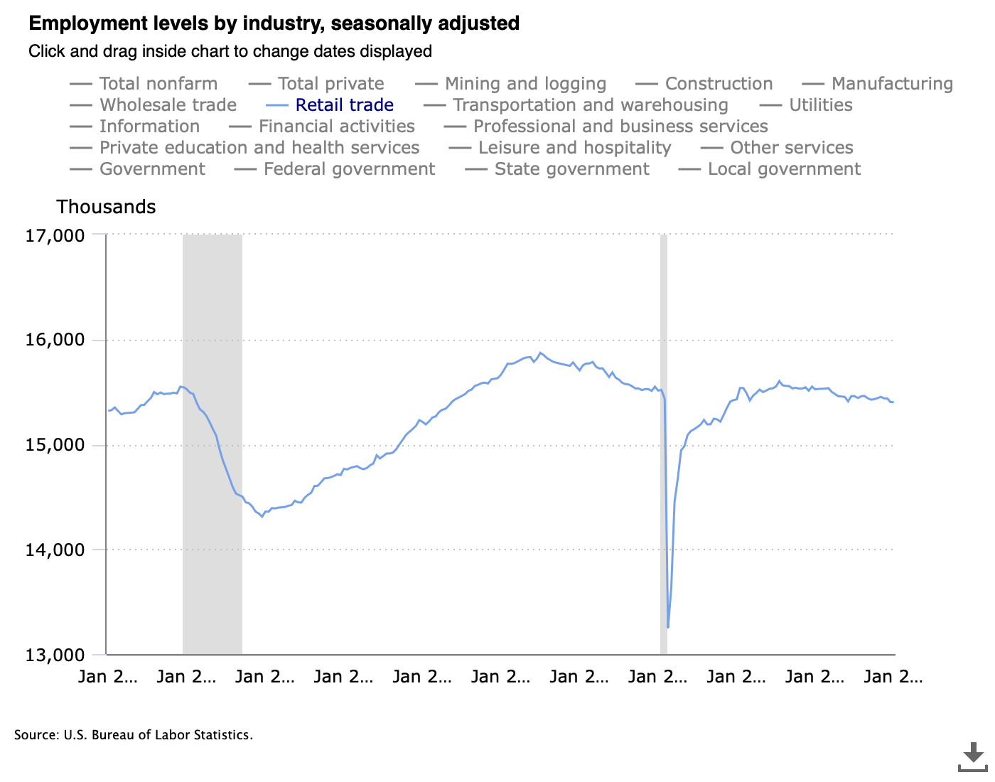 What about retail? A segment of the economy that grows steadily year after year? There are no more jobs today than there were in 2006, thanks to Amazon and online retail.