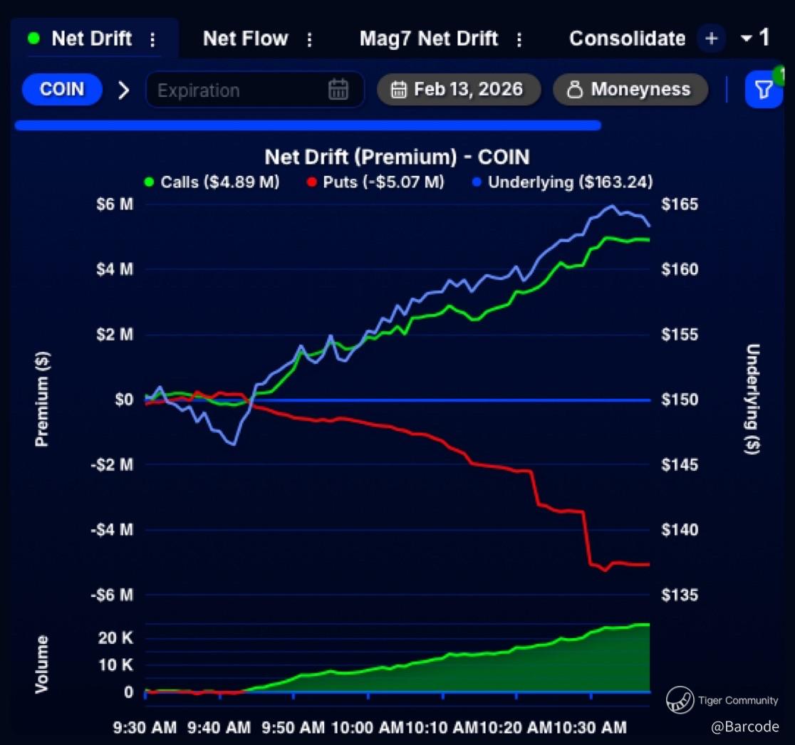 Coinbase is up ~15%, with aggressive bullish flow backing the move: