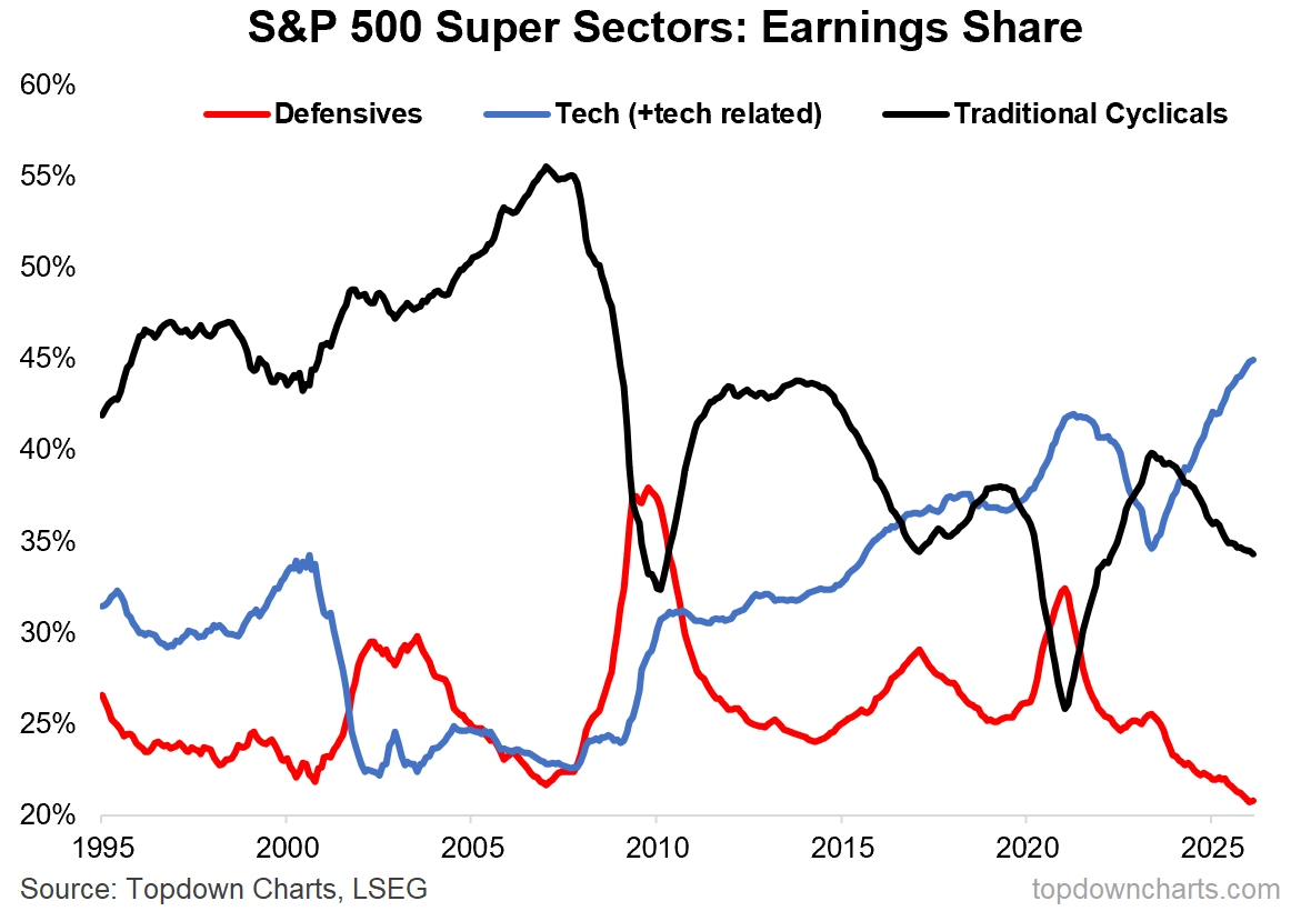 Meanwhile, the history of defensives’ earnings weight tells us exactly why they are called defensives — because in times of turmoil and downturn, defensives’ earnings just keep plodding along and become a larger share of the index as tech and cyclicals ex-tech see earnings crunched by crisis, sector boom/bust cycles, and recessions.