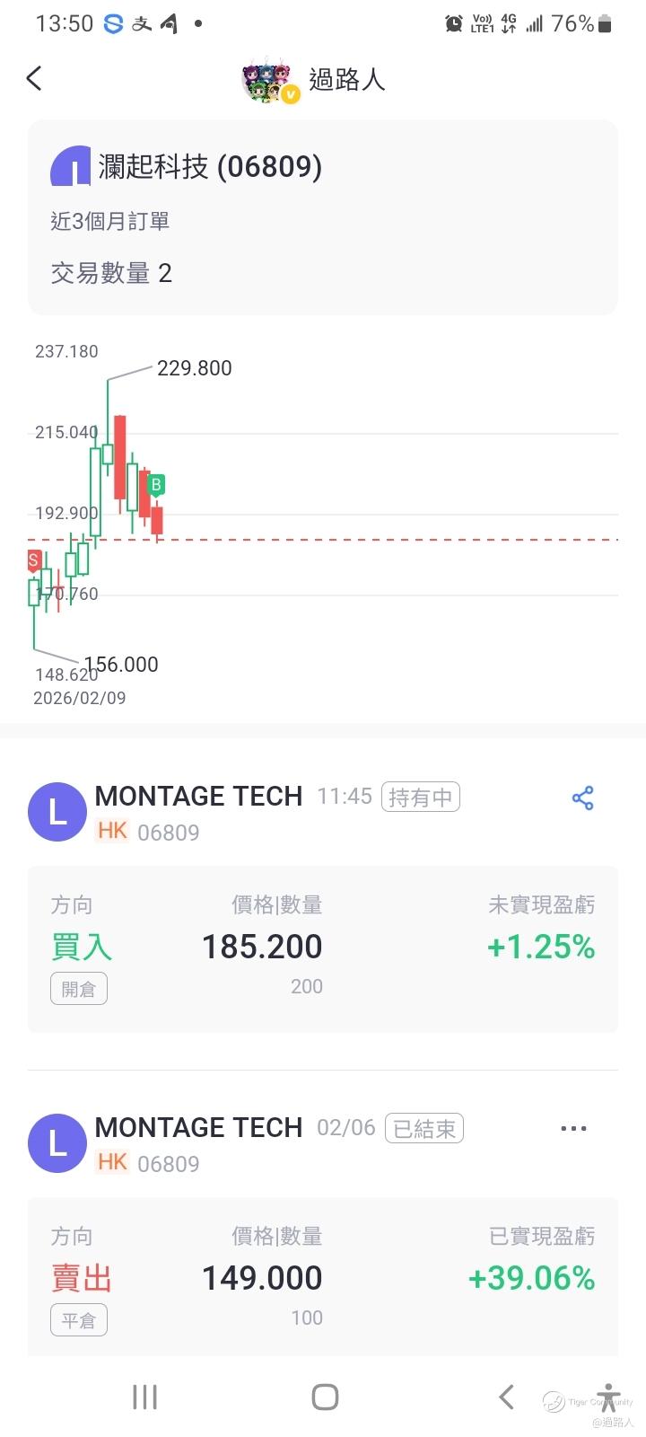 $MONTAGE TECH(06809)$ 抽新股既時候以149沽出。一個月都唔夠而家185.2買返。算唔算高追?無計架喎。想賺錢係要博下架啦。今次買返200股。如果回升放100股留100股[胜利]