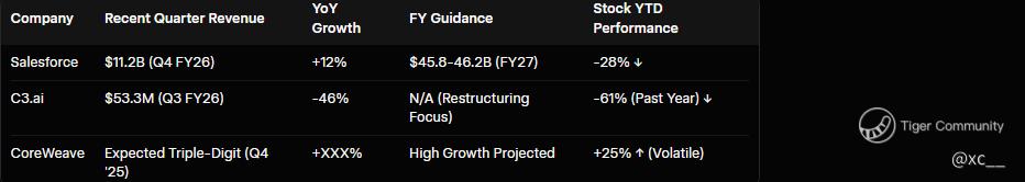 $CoreWeave, Inc.(CRWV)$ Buckle up, folks! The AI landscape is shaking like a glitchy neural net. 😵💫 With Salesforce dropping a solid Q4 beat but whispering softer vibes for the future, C3.ai swinging the axe on jobs amid epic misses, and CoreWeave dodging infrastructure potholes— is this the great AI software reset we've been whispering about? Let's dive deep into the drama, crunch the numbers, and see if near-term wins are getting buried under long-term clouds. No fluff, just facts up to February 26, 2026. 📈